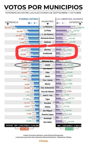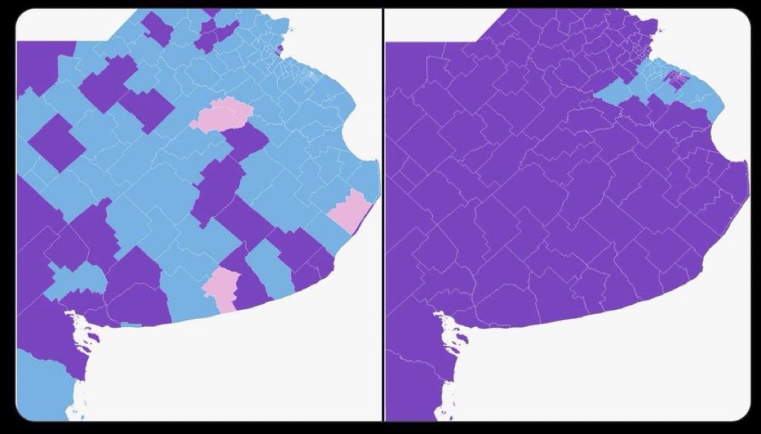IRRECONCILIABLES DIFERENCIAS. A la izquierda, el resultado de la elección que ganó el kirchnerismo el 7 de septiembre con infinidad de boletas y sobres. A la derecha, el resultado casi totalmente opuesto del 26 de octubre, con Boleta Única de Papel y una LLA que arrasó. Aún falta trabajar muchísimo el conurbano para pintar totalmente de violeta una provincia cada vez menos peronista.